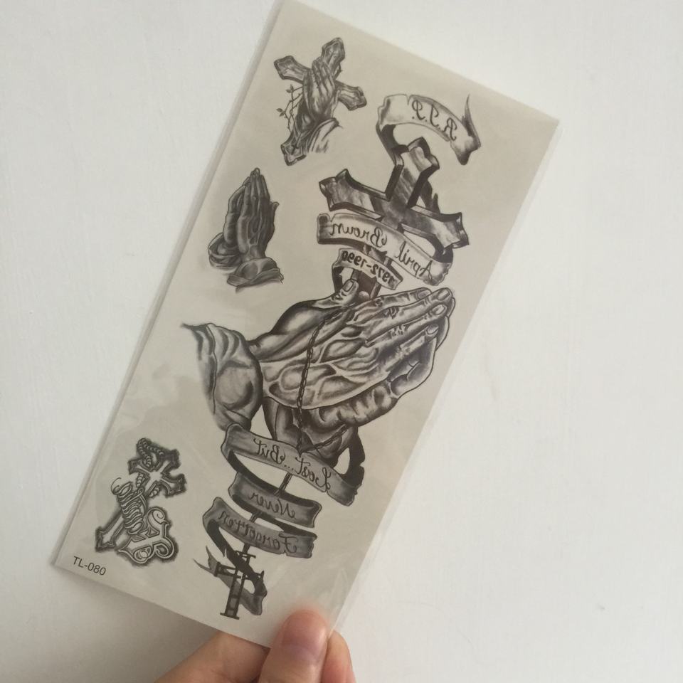 Pegatina de tatuaje temporal Cristiana Cruzada de mano de oración negra de Color puro