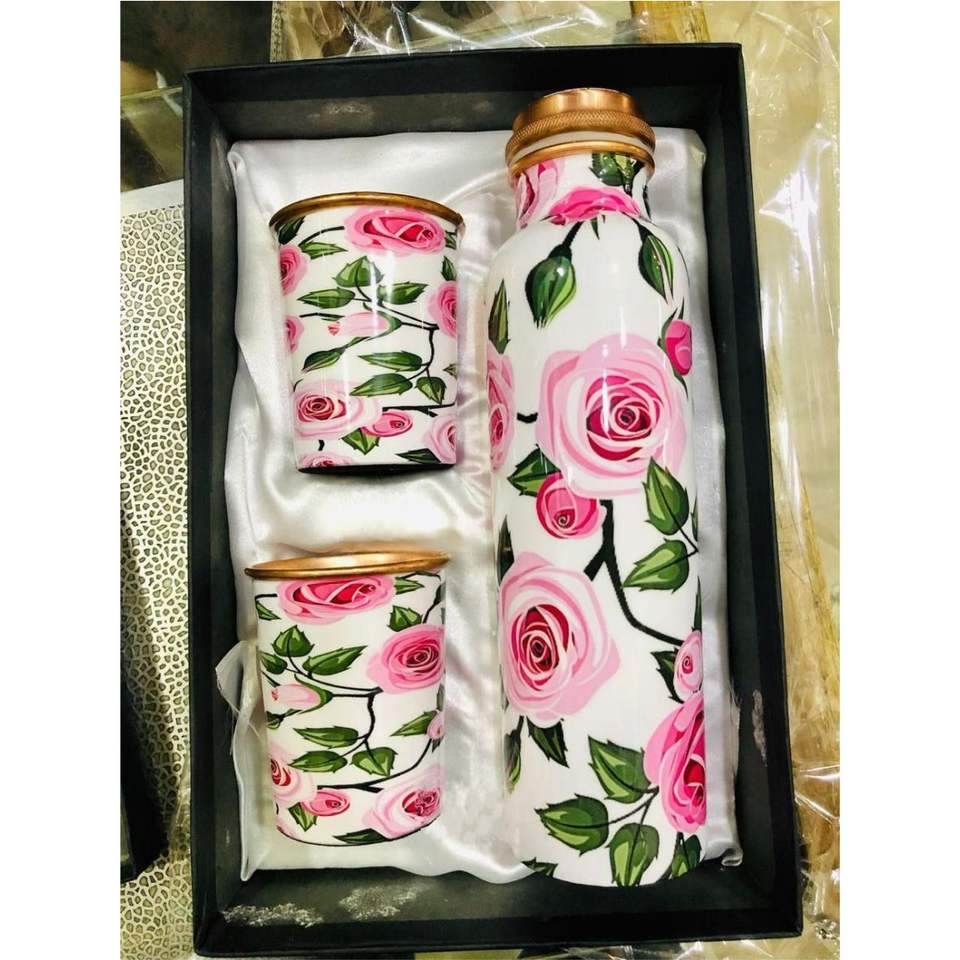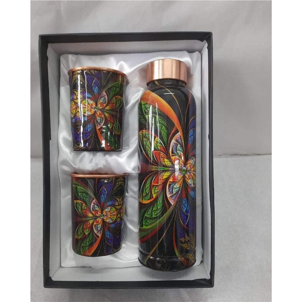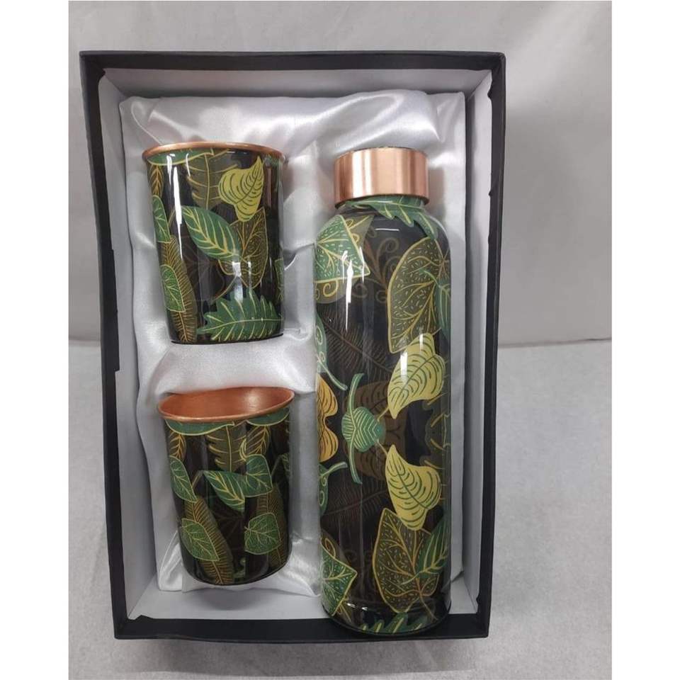 Juego de Botella de Agua de Cobre Puro con 2 Vasos, Diseño Artesanal con Estampado de Hojas, Acabado Lacado, a Prueba de Fugas, Juego de Regalo de Cobre para la Salud Ayurvédica