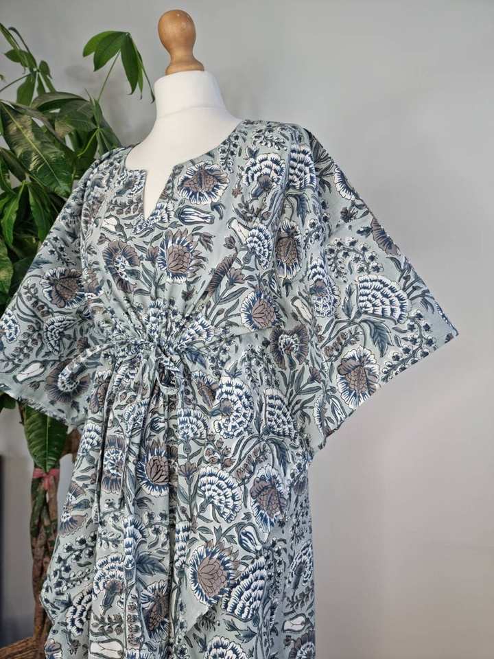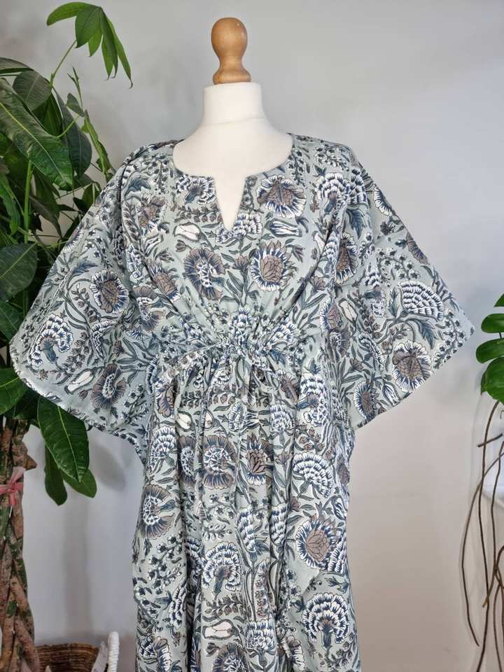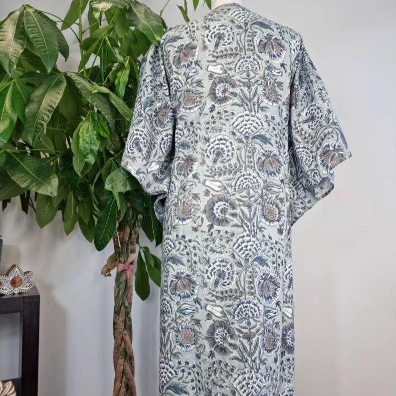Vestido caftán de algodón puro, Kimono de verano con estampado de bloques indios, abrigo de playa Floral, cómodo Maternidad, Primavera, elegante, gris y blanco