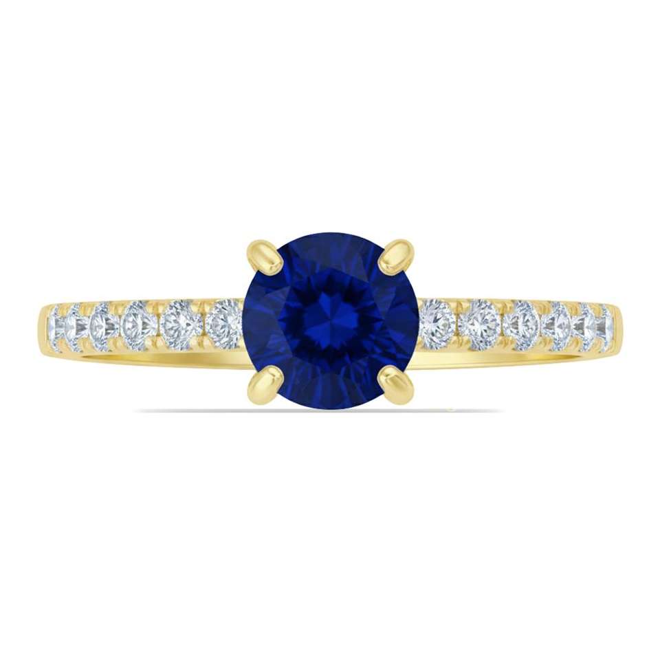 Anillo de Oro Puro de 14K/18K con Zafiro Azul de Corte Redondo y Diamante Natural con Engaste de Puntas