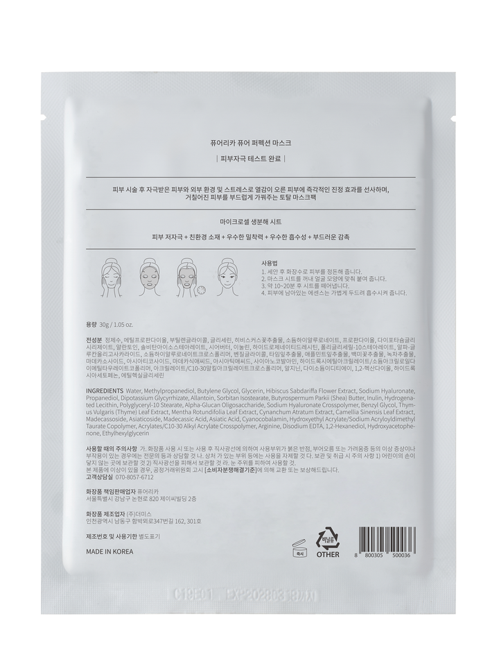 Mascarilla Pure Perfection para Piel Sensible, Mascarilla Facial Coreana en Hoja, Calmante, Refrescante, Té Verde Natural, Ecológica