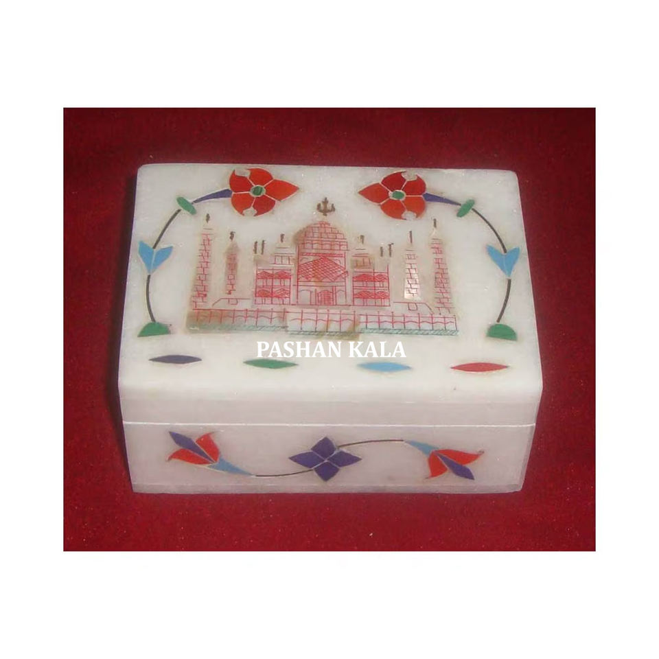 Mármol blanco puro con acabado fino y forma rectangular pulida suave Único Taj Mahal y caja de joyería con diseño de incrustaciones de flores