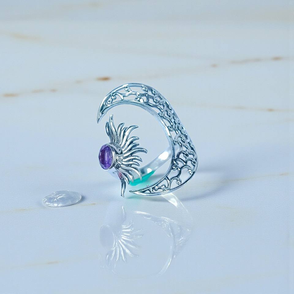 Anillos de Plata de Ley 925 Hechos a Mano con Gema de Amatista Morada Tallada, Diseño Cielo y Luna
