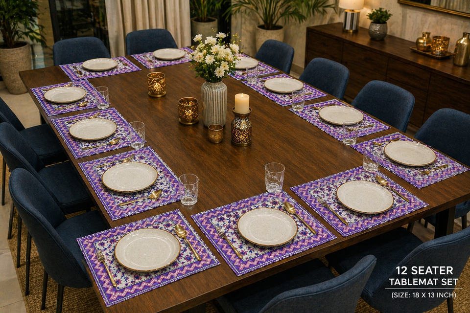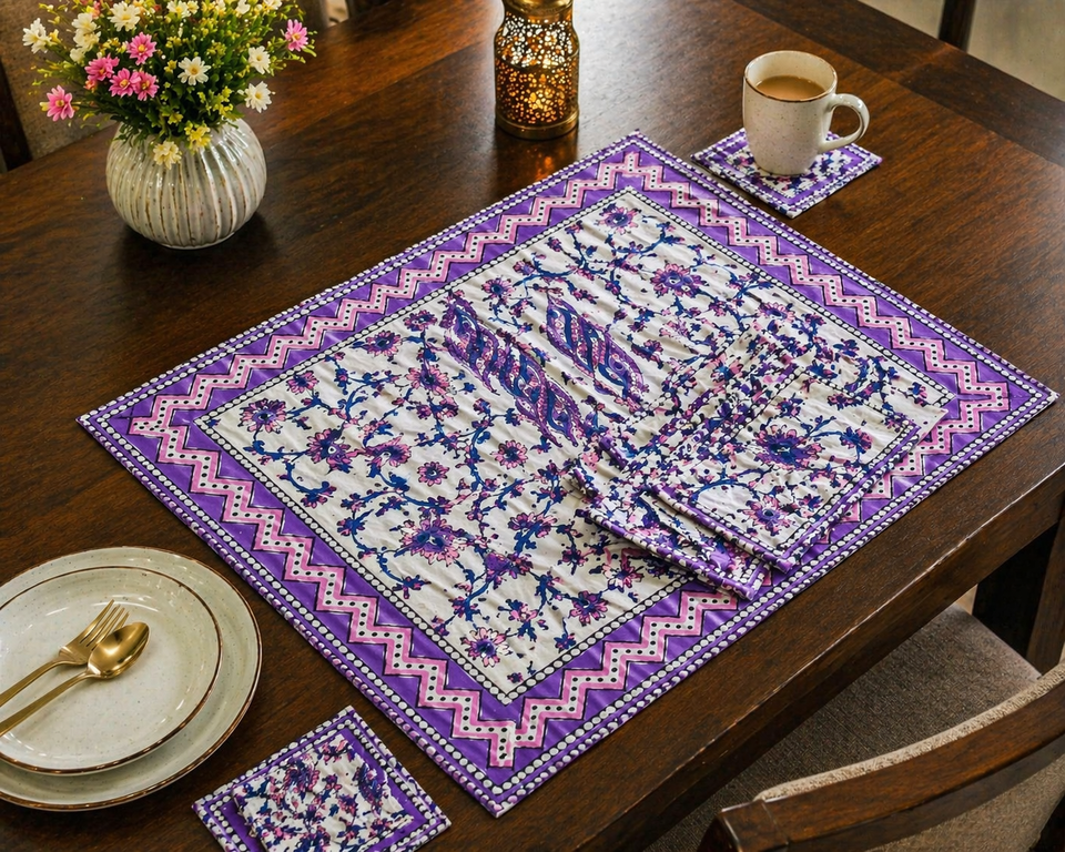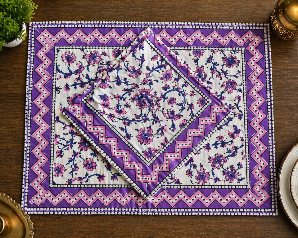 Juego de Manteles Individuales de Algodón Blanco con Estampado Artesanal Bagru Morado, Color Vegetal, Calidad de Exportación, Lavable, Conjunto Maestro