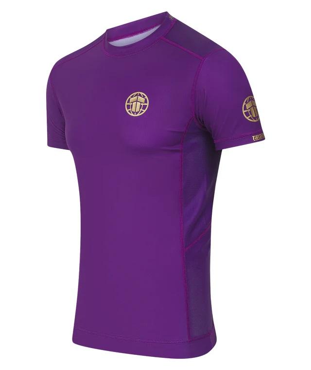 Camiseta Deportiva Transpirable de Manga Corta Color Morado con Logotipos en Contraste y Diseños Impresos por Transferencia de Calor