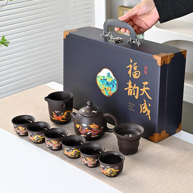 Juego de té Kung Fu de arcilla morada con diseño de dragón, caja de regalo completa para regalos festivos