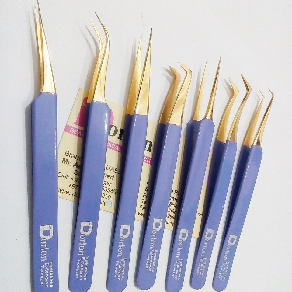 Pinzas de pestañas con puntas chapadas en oro recubiertas de Color púrpura, pinzas de extensión de pestañas en forma de L con logotipo personalizado de acero inoxidable