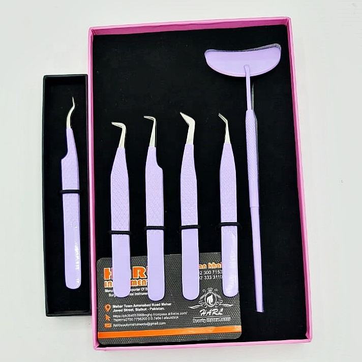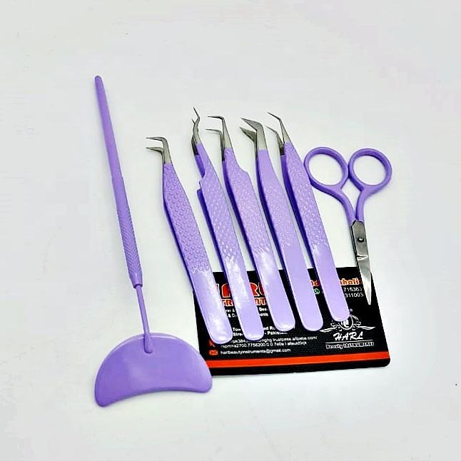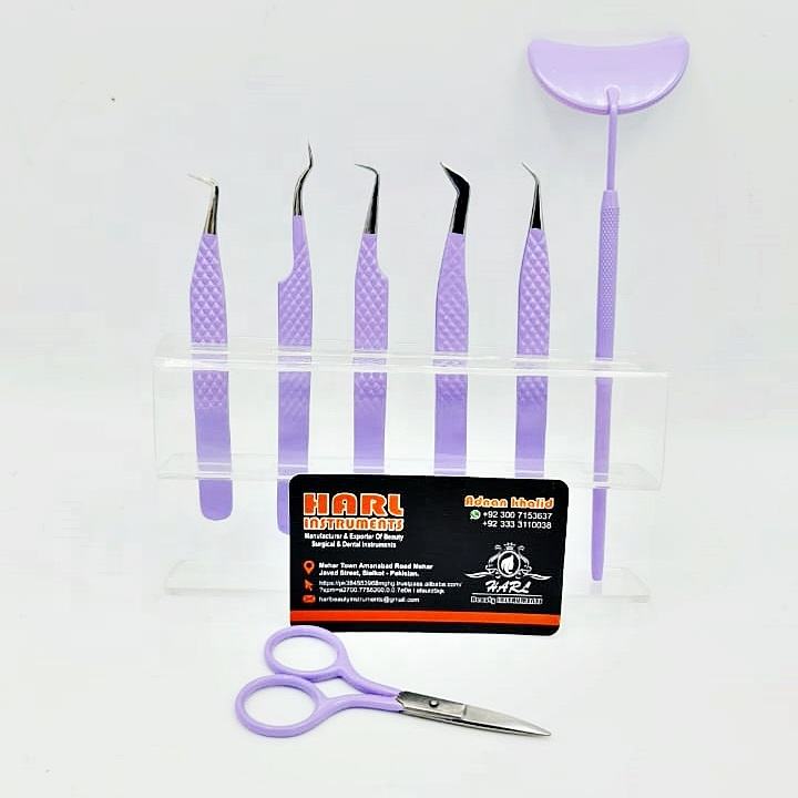 Juego de Pinzas para Extensión de Pestañas con Puntas Puntiagudas de Acero Inoxidable Antimagnéticas de Color Morado, Tijeras Pequeñas, Espejos para Pestañas y Barras para Pestañas