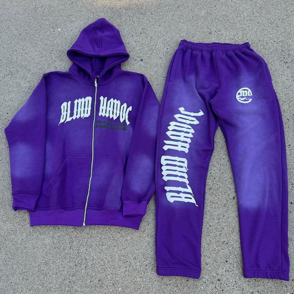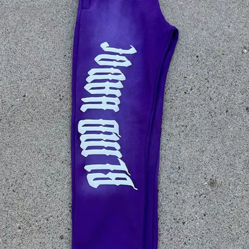 Color púrpura Buen proveedor Diseño personalizado Su propio lavado ácido Puff Print Hombres 100% Material de algodón orgánico Chándales
