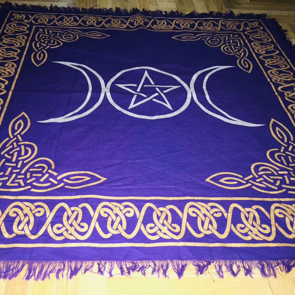 Mantel de Altar Cuadrado Morado Dorado con Estampado de Tarot, Cubierta de Mesa Triple Luna Pentagrama, Tapiz de Pared Hecho a Mano por Consignatarios Indios