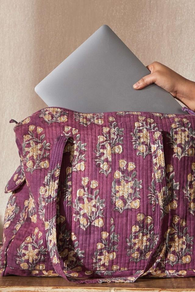 Bolsa de Viaje Deportiva Casual de Lujo, Fabricada en Algodón Slub Estampado a Mano en Color Morado, de Gran Capacidad, Duradera, Ecológica y Táctica