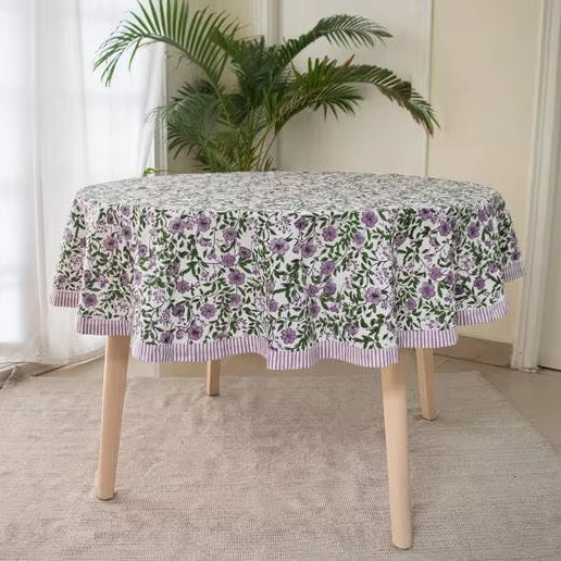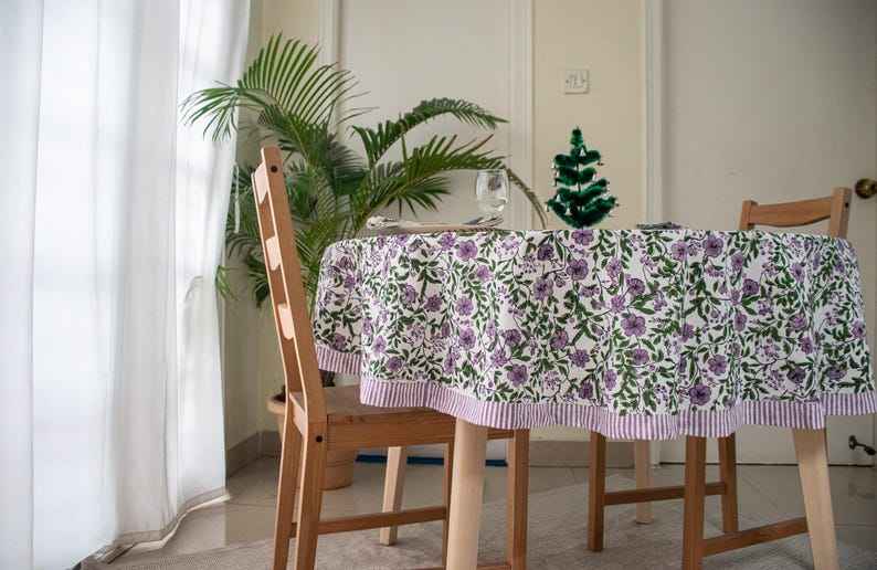 Mantel con estampado floral de bloque hecho a mano indio púrpura cubierta de mesa de cocina y vida casera francesa