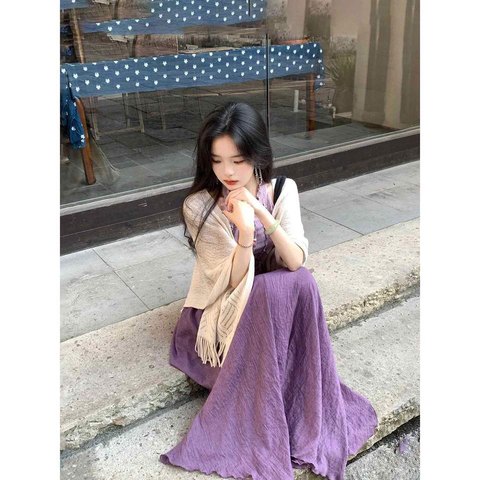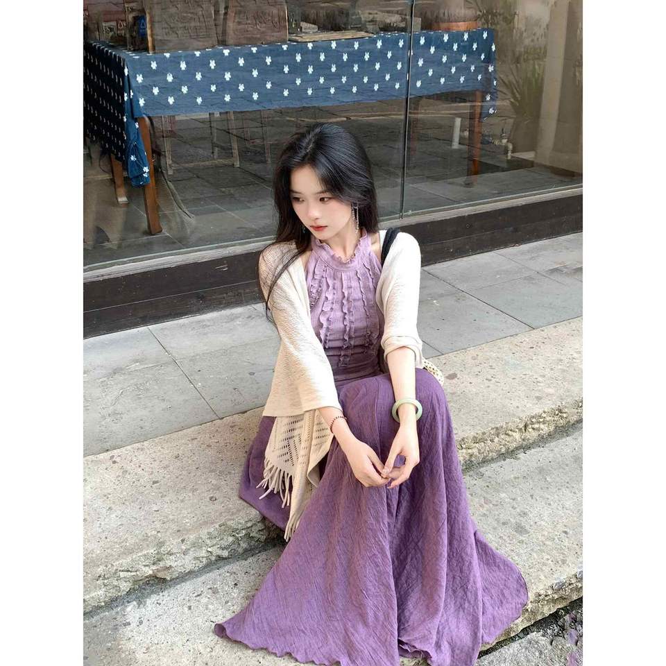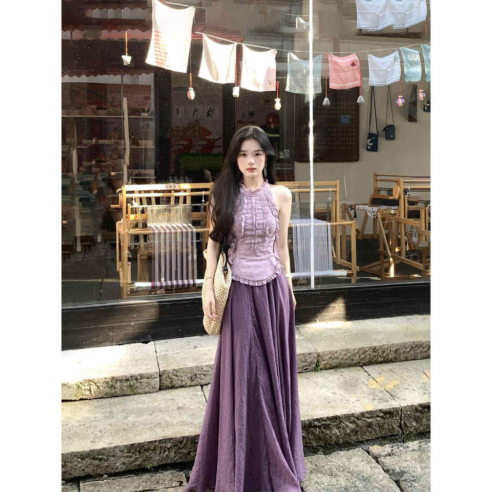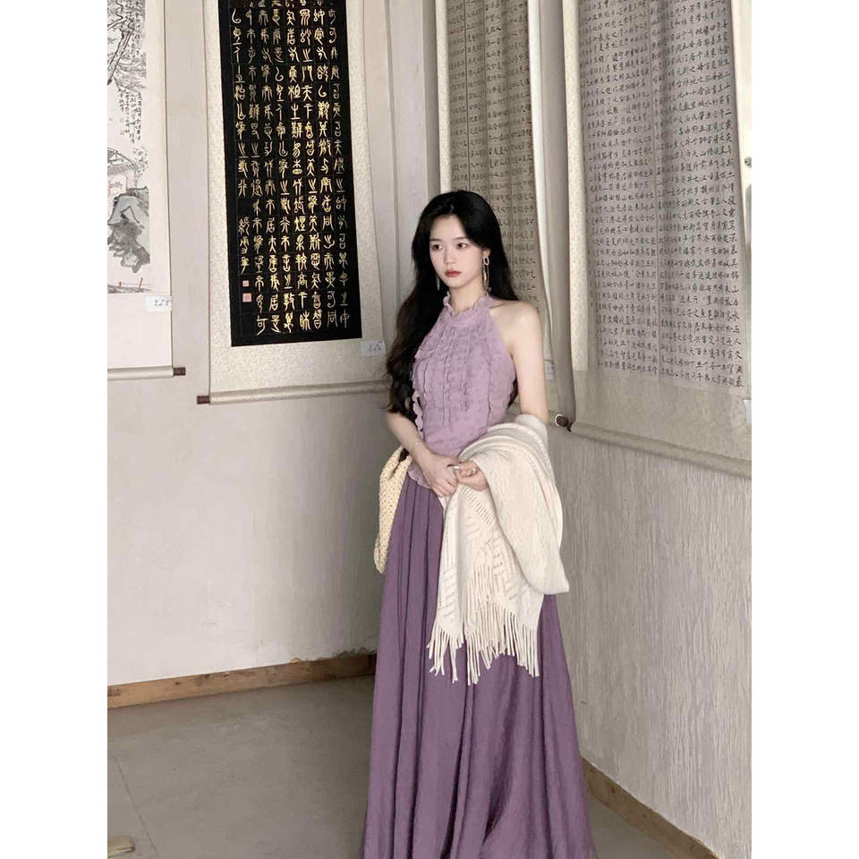 Conjunto de Dos Piezas con Top Halter Morado con Volantes y Falda Larga en Línea A, Cheongsam/Qipao Tradicional Chino sin Mangas, Traje de Fiesta para Mujer