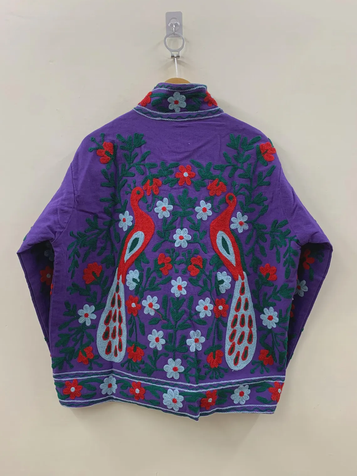 Abrigo corto bordado de terciopelo púrpura Suzani, chaqueta de invierno étnica Floral de pavo real, estilo Vintage uzbeko con prendas de vestir exteriores de cuero de pescado