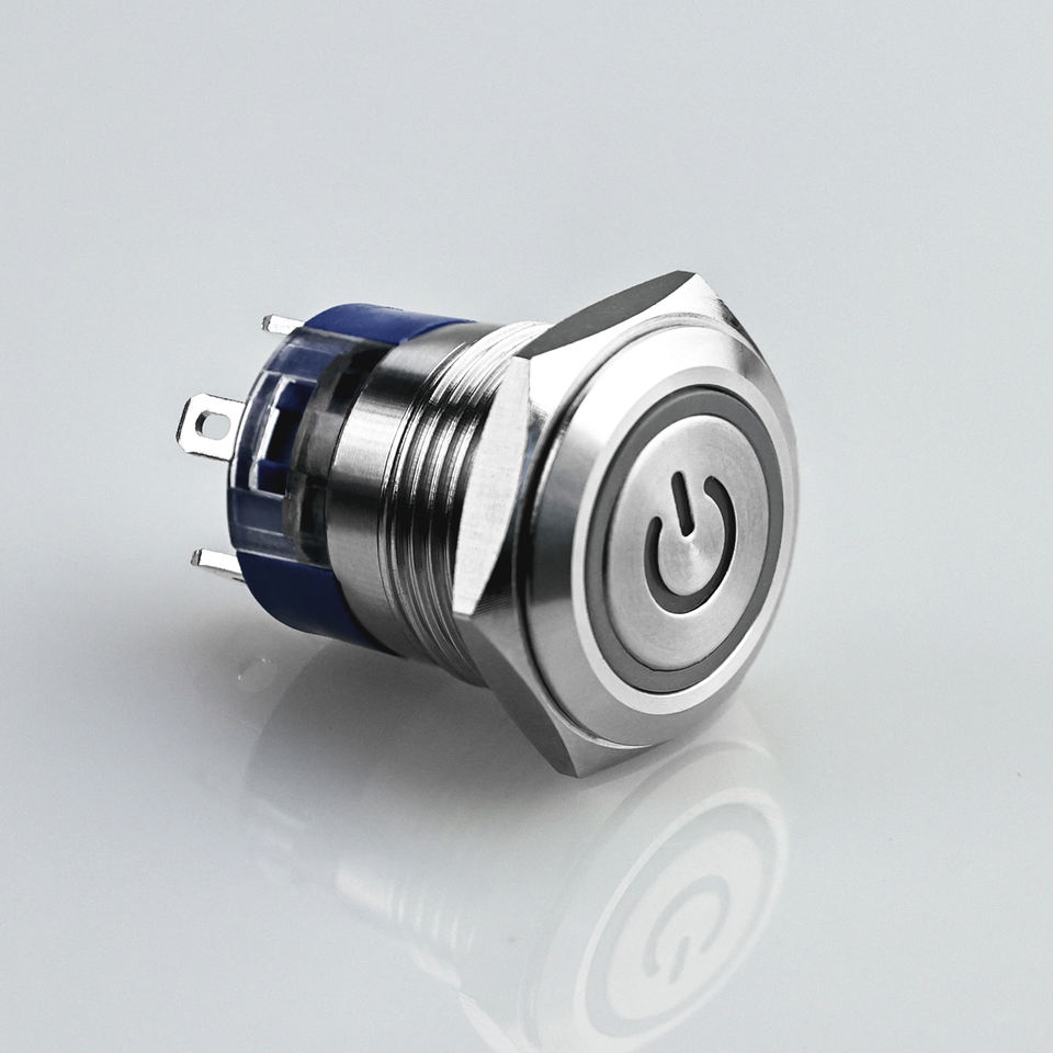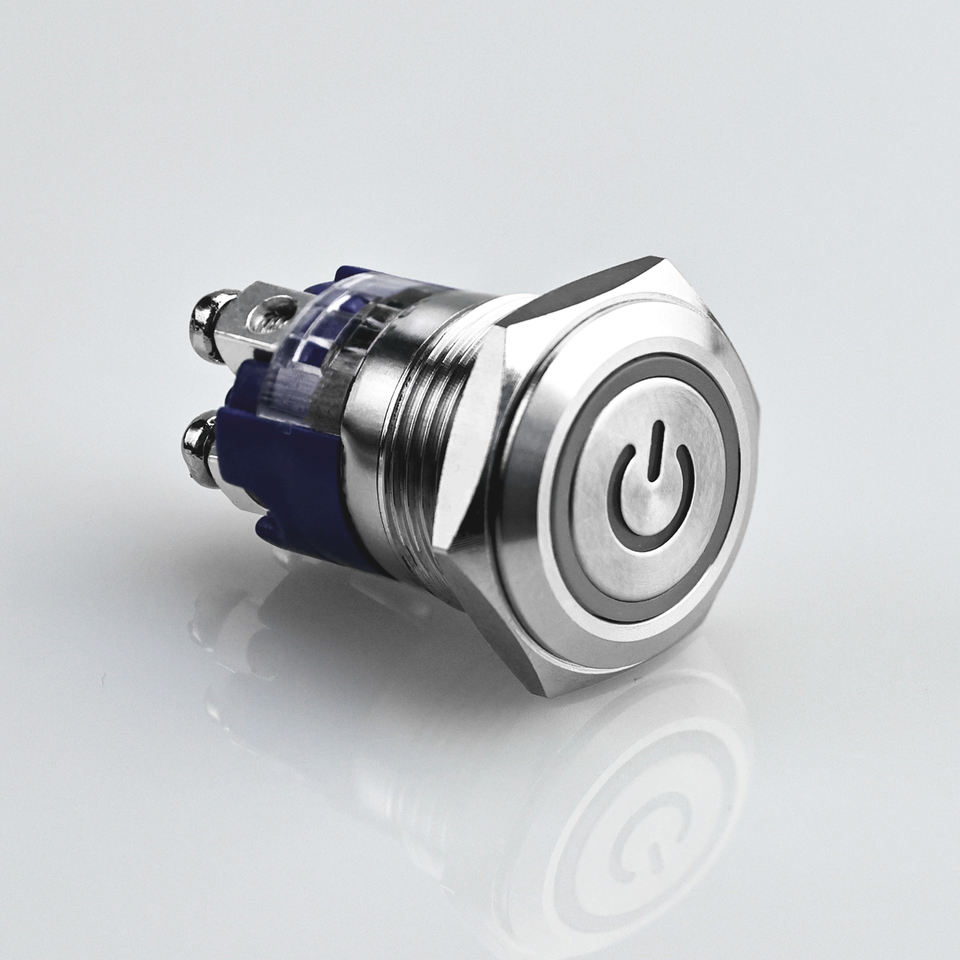 Interruptor de botón con carcasa metálica duradera, con opción de acción momentánea o de bloqueo, y anillo LED
