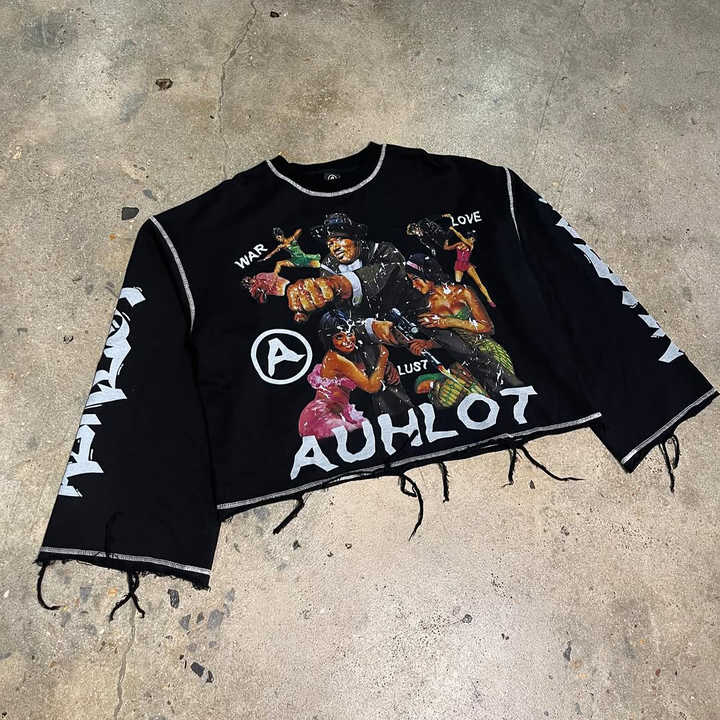 QYOURECLO logotipo personalizado bordado Dtg estampado Camiseta 100% algodón borde cortado desgastado manga larga Boxy camiseta de gran tamaño