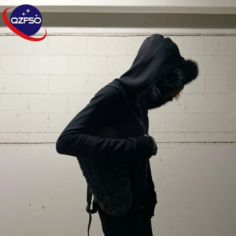 Sudadera con Capucha Personalizada QZFSO Negra Delgada con Logotipo Bordado Personalizado 100% Algodón con Cierre Completo y Cuello de Piel Sintética Desmontable para Hombre