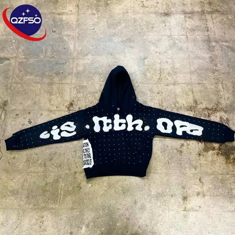 QZFSO alta calidad de gran tamaño 400 Gsm 100% francés Terry peso pesado parche desgastado bordado etiqueta logotipo personalizado Rhinestone Sudadera con capucha
