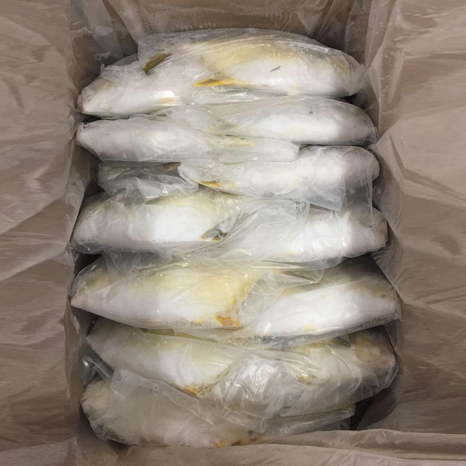 wr paquete iwp de pompano dorado, Paquete a granel de pompano dorado., Paquete familiar de pomfret dorado, Pez dorado IQF IWP envasado, Pomfret dorado envasado IVP, Pomfret dorado envasado al vacíoEmpaque