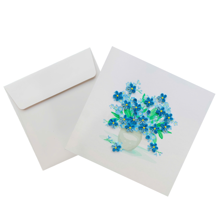 Tarjeta de quilling con ramo de flores azules en jarrón, tarjeta de felicitación hecha a mano con sobre, tarjeta floral de quilling especial para todas las ocasiones