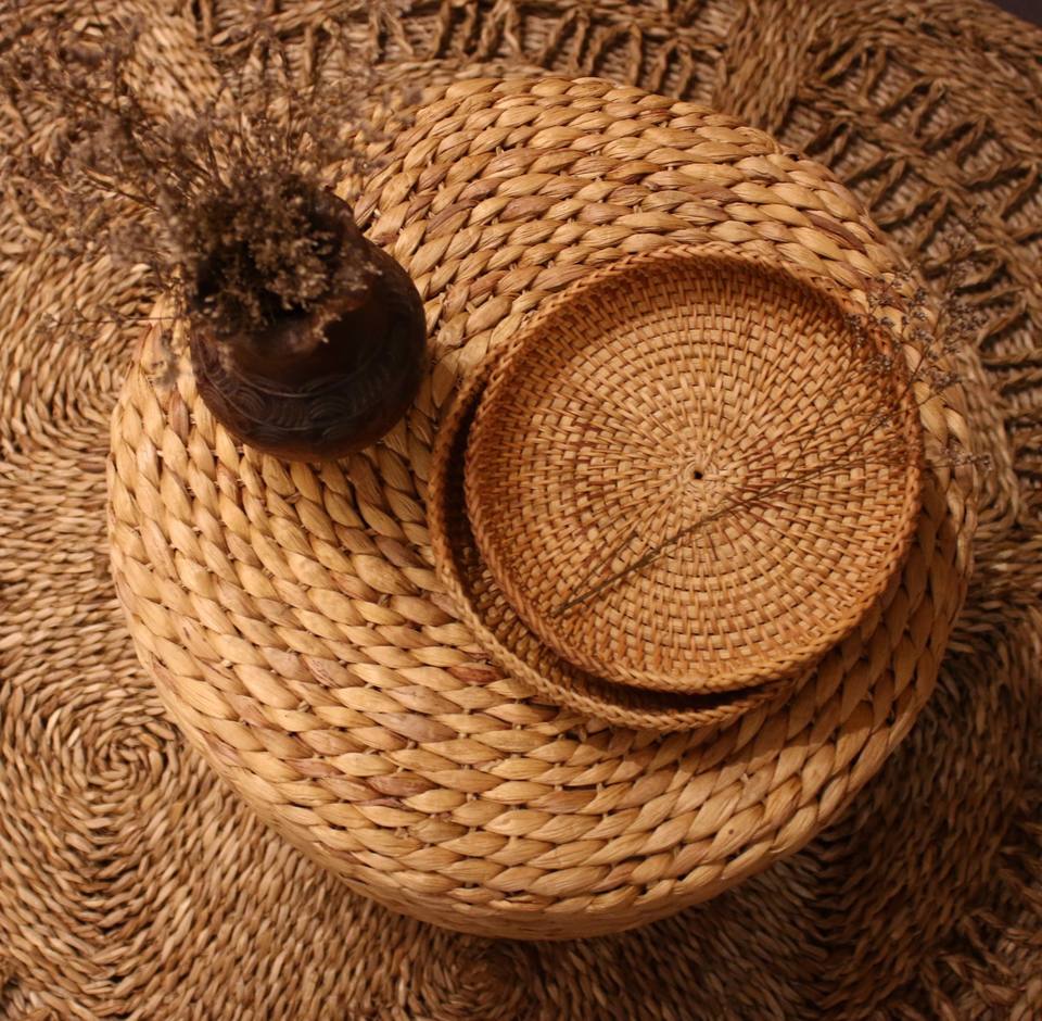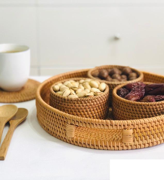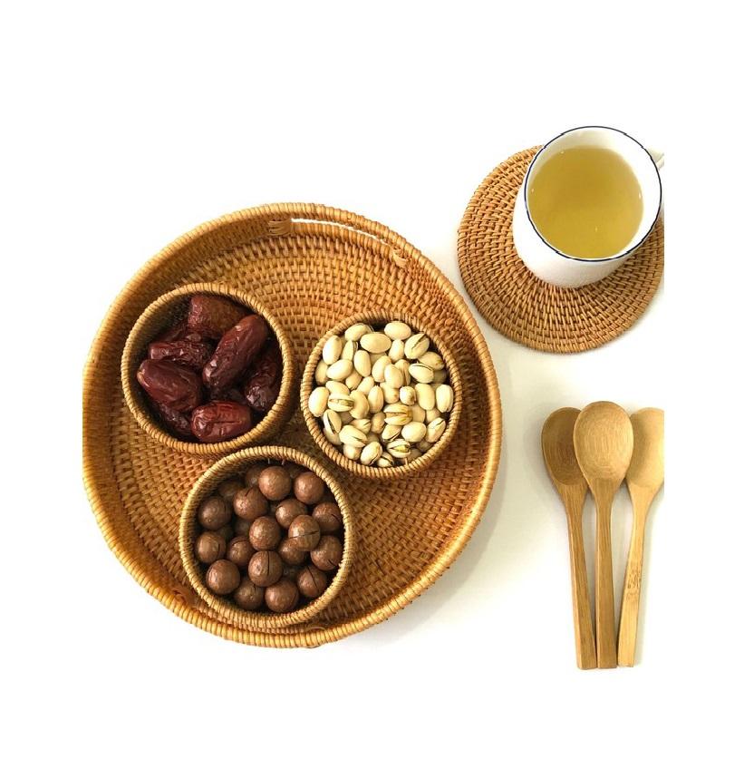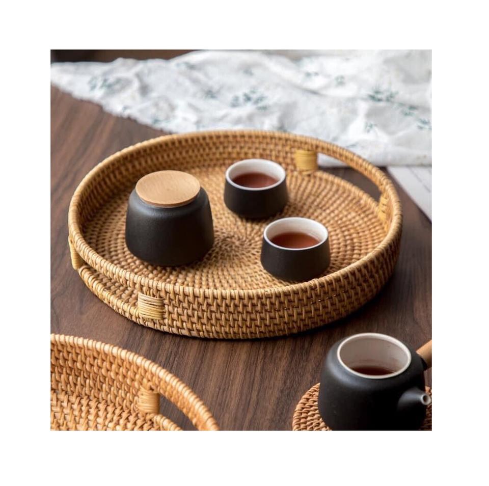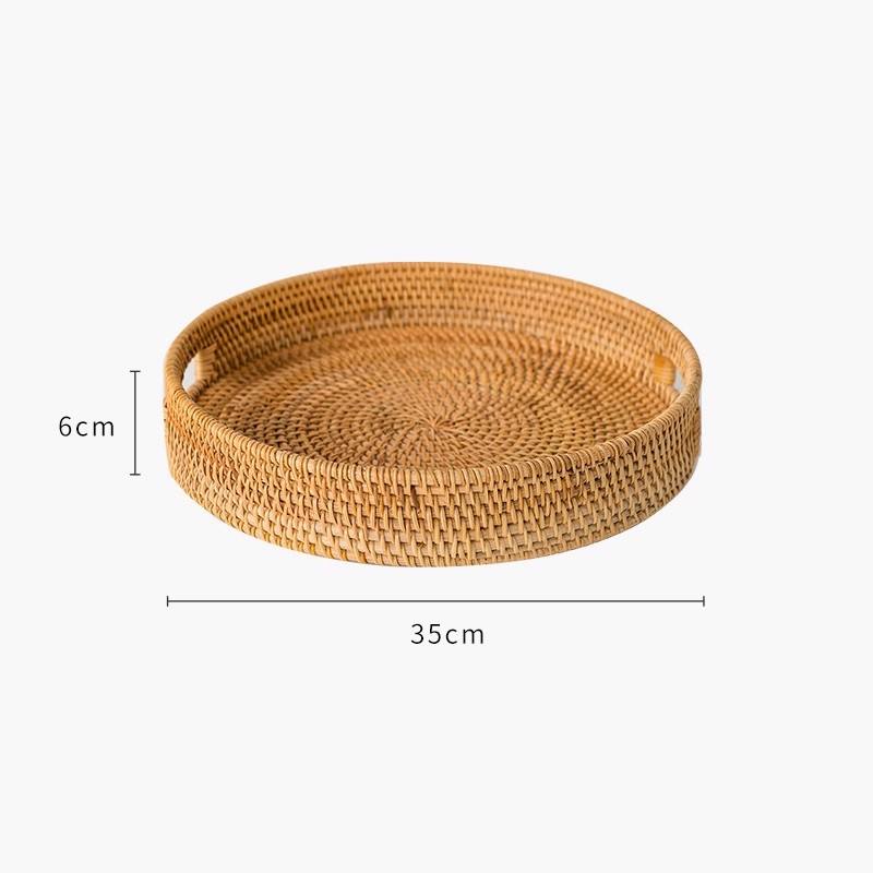 Bandeja de mimbre redonda, duradera, con mango