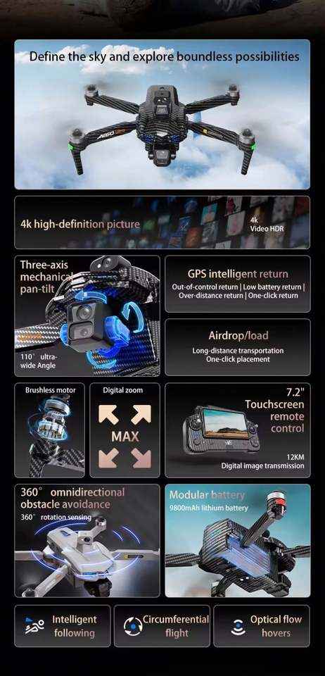 Drones RC con Cámara 4k y GPS de Largo Alcance, Gimbal Brushless de Tres Ejes, Transmisión de Video Digital, Evitación de Obstáculos Láser