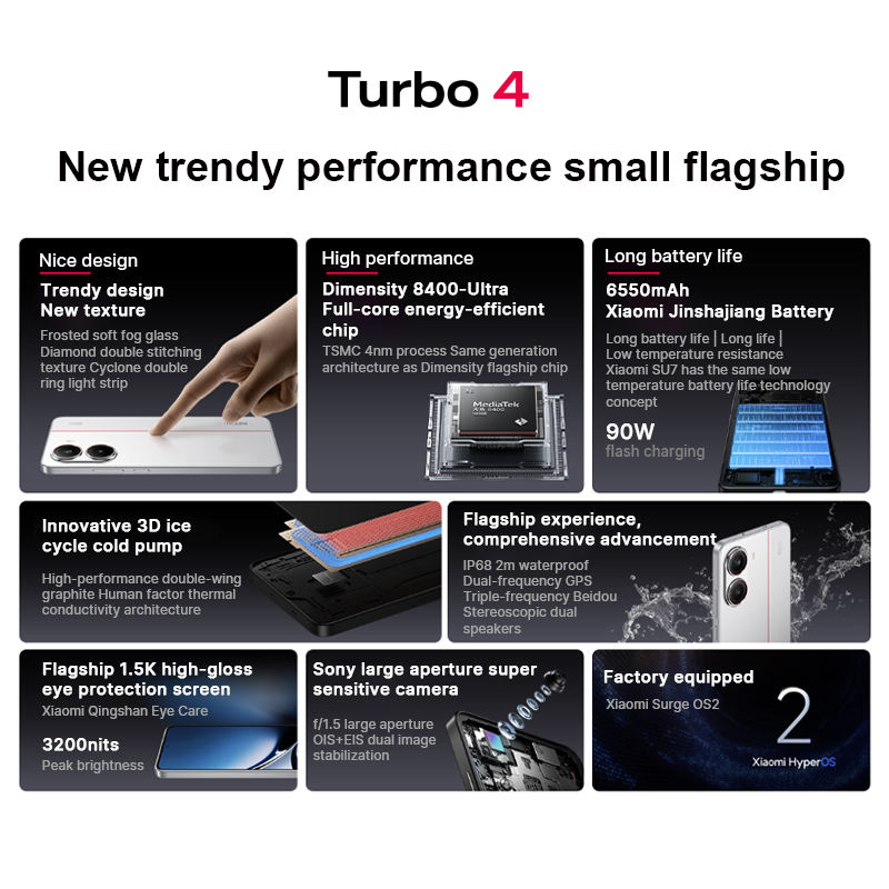 REDMI Turbo 4 5G CPU Dimensity 8400-Ultra Pantalla de 6.67 pulgadas con alto brillo y protección ocular Xiaomi HyperOS 2 Versión China