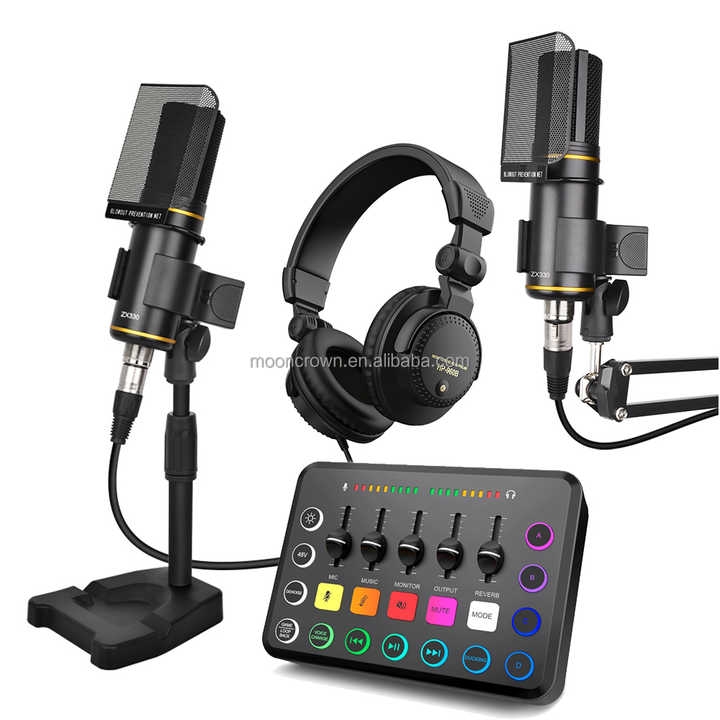 Paquete para podcast: mezclador de audio profesional con phantom 48V y RGB, micrófono condensador XLR para estudio y tarjeta de sonido SC3
