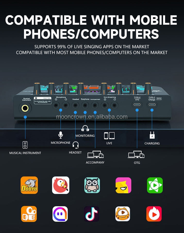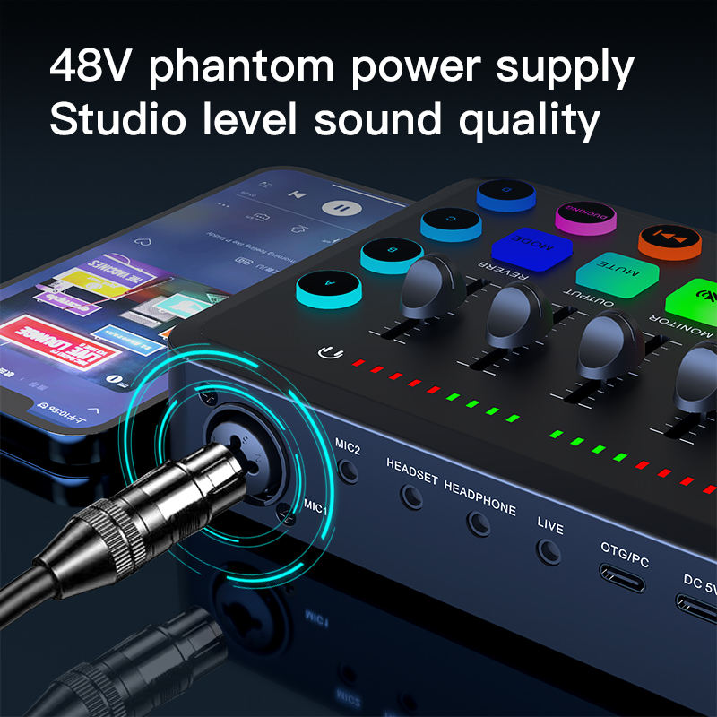 Alimentación fantasma de 48V: Proporciona la energía necesaria para los micrófonos de condensador, asegurando una grabación de audio clara y de alta calidad.