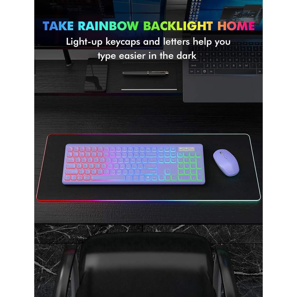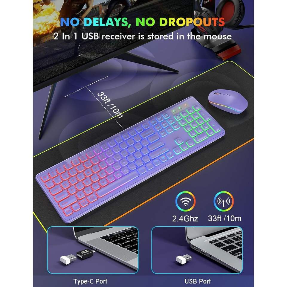 Combo de Teclado y Ratón Inalámbrico RGB Retroiluminado de Tamaño Completo, Escritura Suave y Modo de Reposo con Letras Luminosas Recargables, Tecnología Q de 2.4GHz
