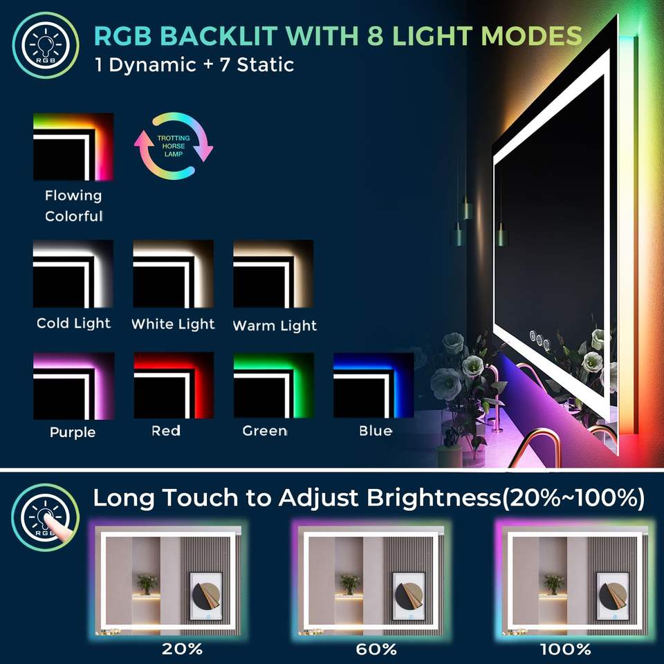 Espejo de Baño con Iluminación LED RGB Frontal y Espejo de Tocador Retroiluminado RGB para Tocador de Baño