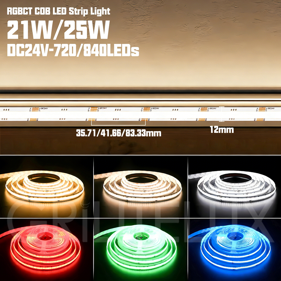 Tira LED RGBCCT COB de 24V, 720 LEDs/m, Cinta Flexible sin Costuras para Soluciones Lineales Decorativas de Interiores Residenciales Modernos