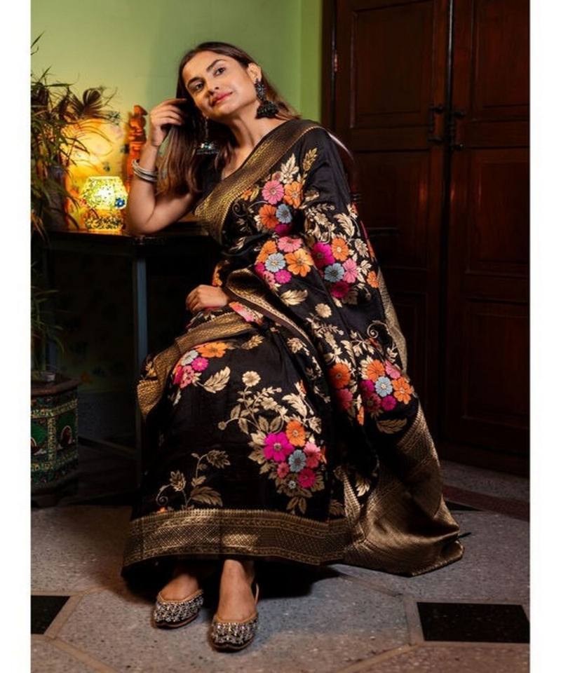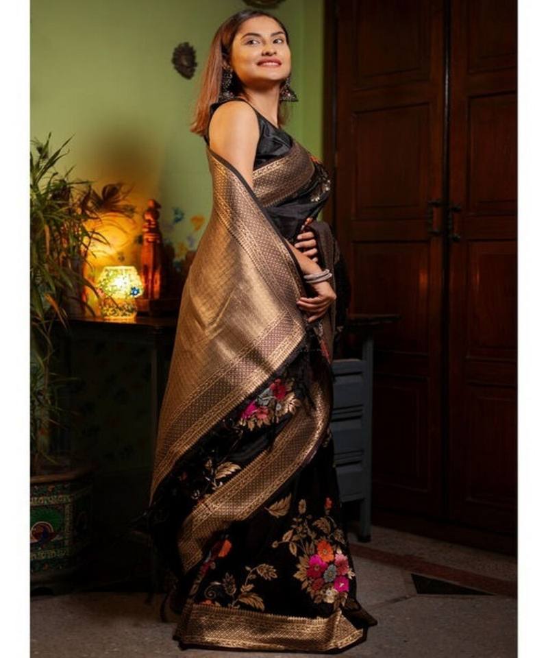 Sari de Seda Banarasi con Bordado Dorado, Estilo Rico, Blusa Sin Costuras, para Fiestas, Precio al por Mayor, Prenda Étnica Moderna, Color Negro