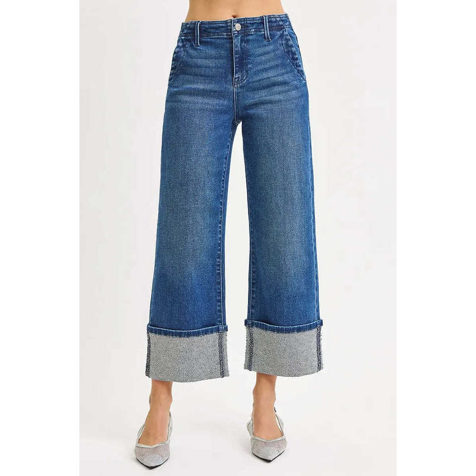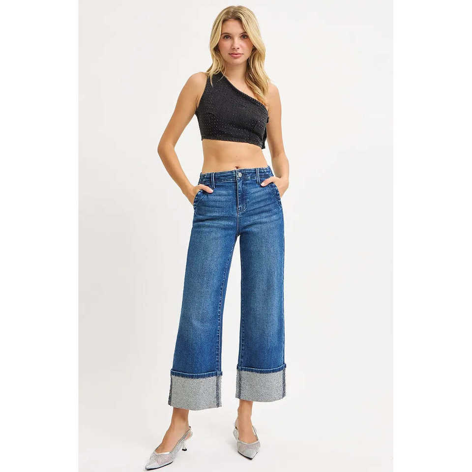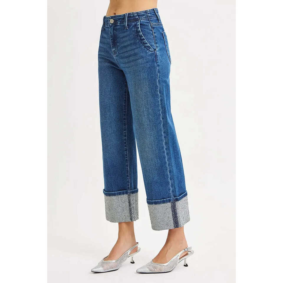 Jeans de Mujer RISEN de Talle Alto con Detalle de Pedrería en el Tobillo