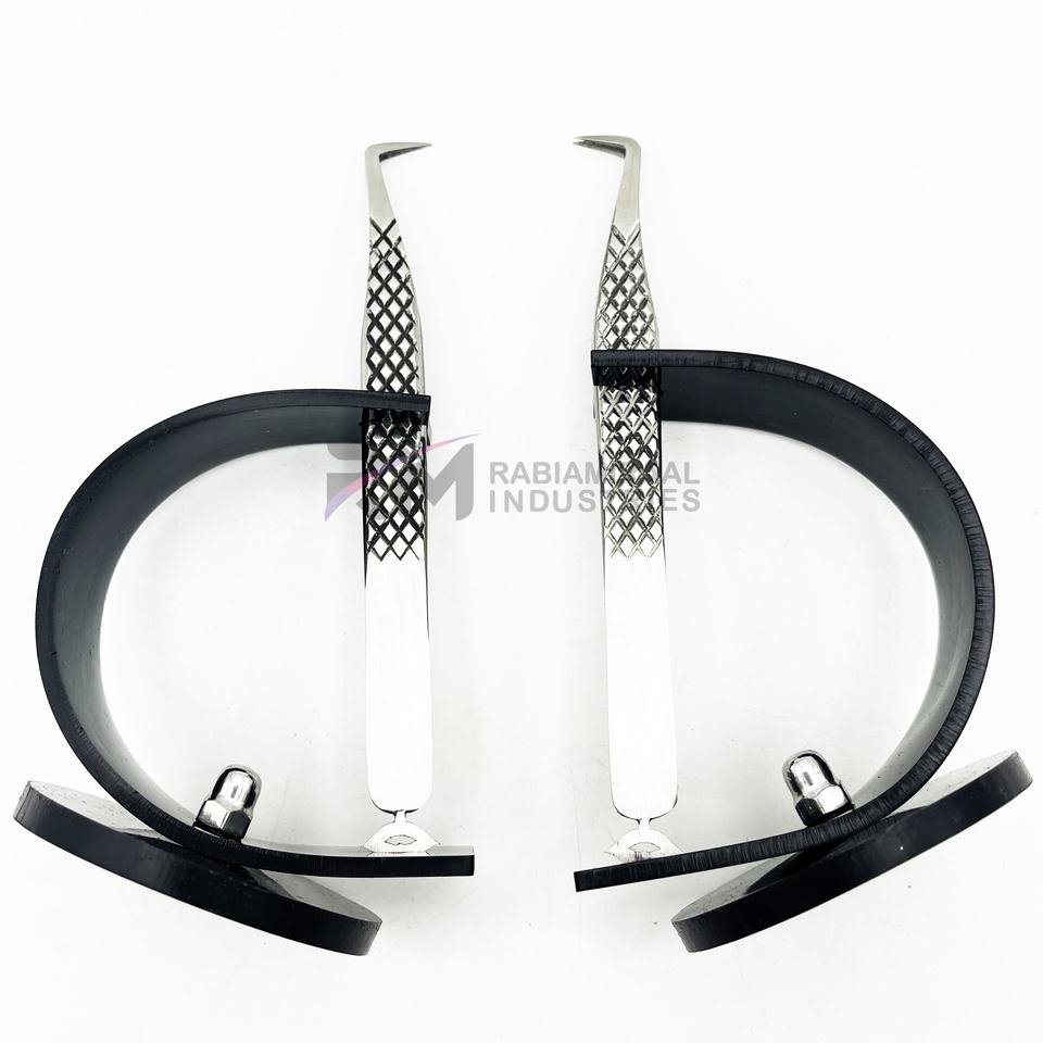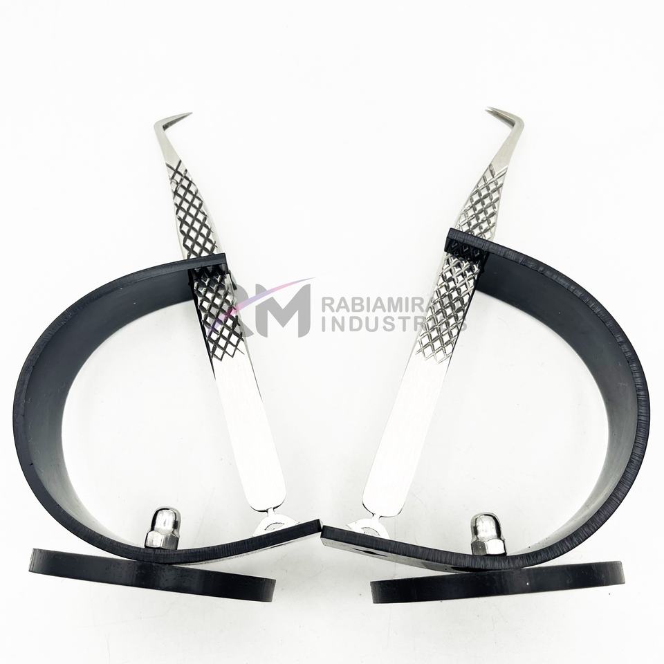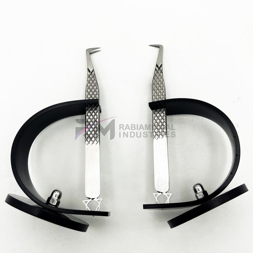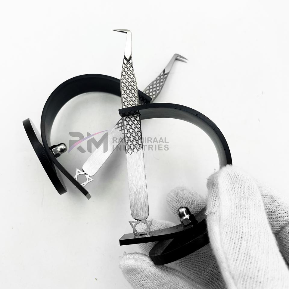 Pinzas Profesionales RMI para Extensión de Pestañas con Punta Plateada y Agarre de Diamante, con 1 Soporte para Pinzas de Color Negro