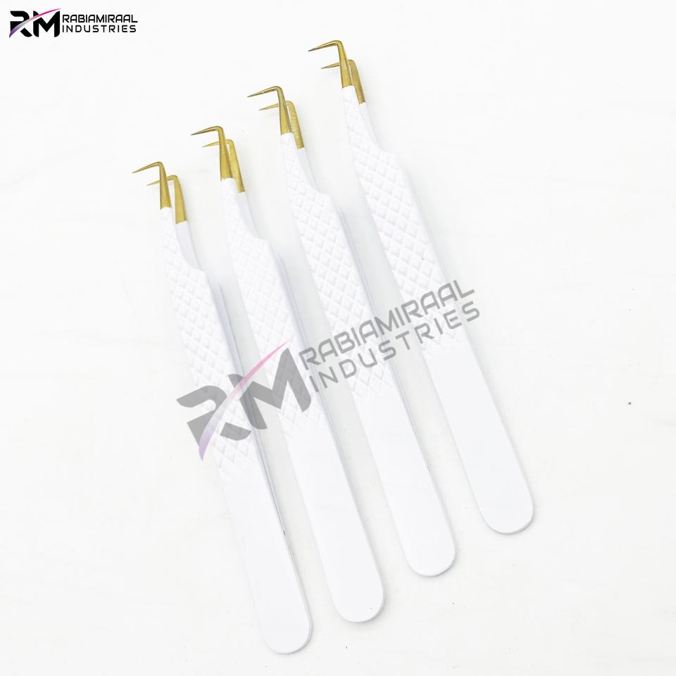 RMI Bota Regular de 90 Grados, Punta de Plasma Dorada, Juego de Pinzas de Extensión de Pestañas con Agarre de Diamante Recubierto de Polvo Blanco