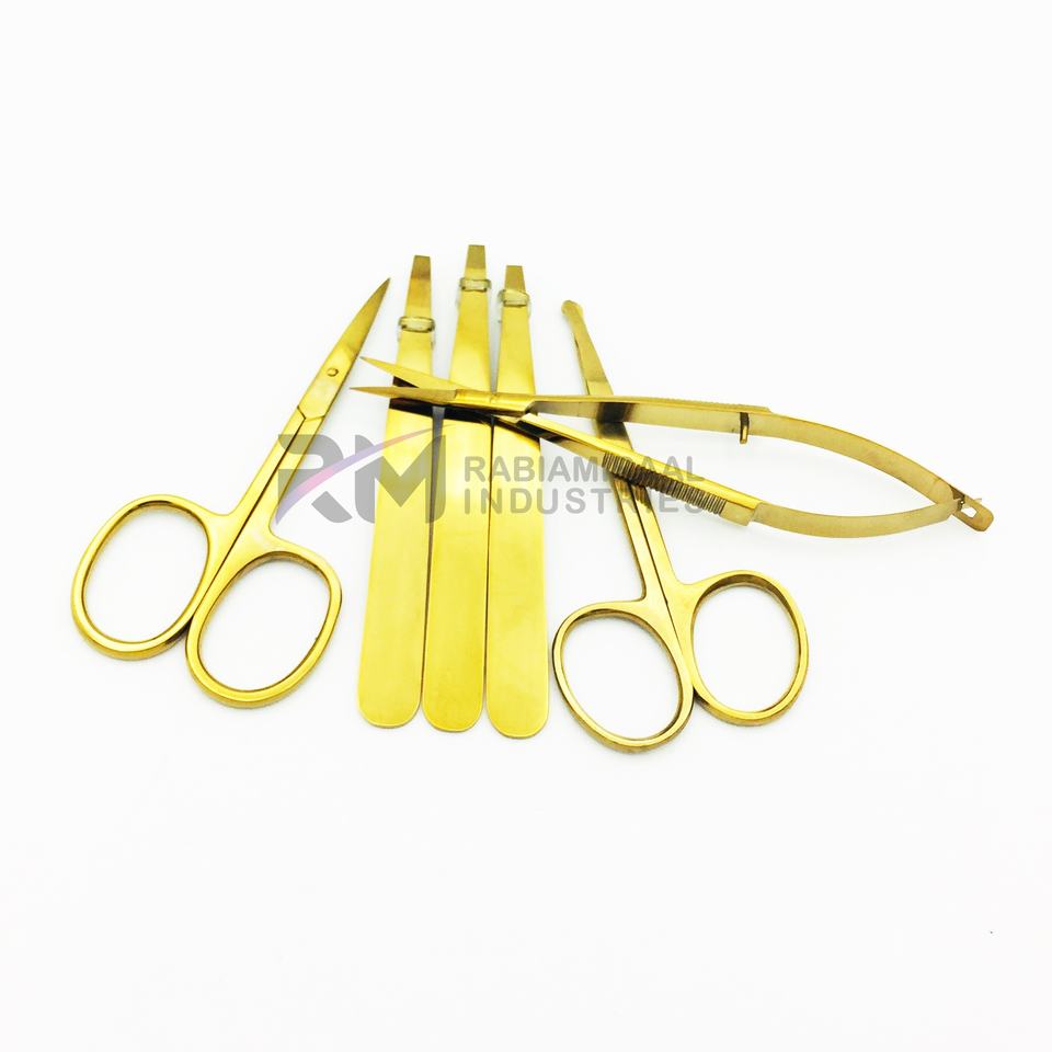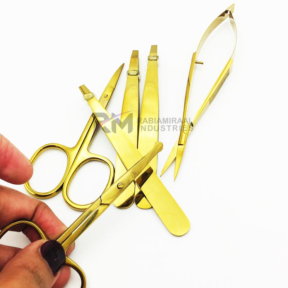 Pinzas para cejas inclinadas, cuadradas y puntiagudas RMI con tijeras de resorte, juego de pinzas para cejas cosméticas con logotipo personalizado de Color dorado y Plasma