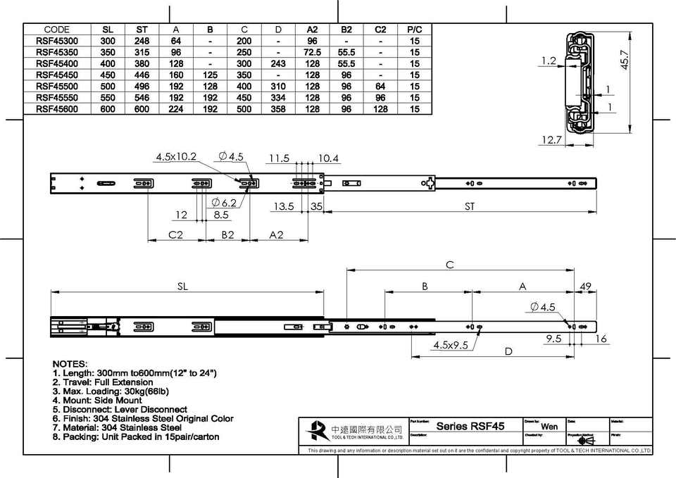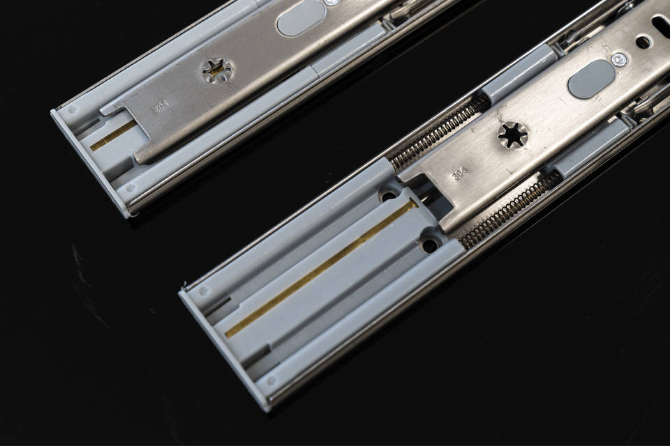 Diapositivas de cajón de cierre suave de acero inoxidable RSF45 304, 45mm, 100LB, guías deslizantes de carga para armarios de herramientas