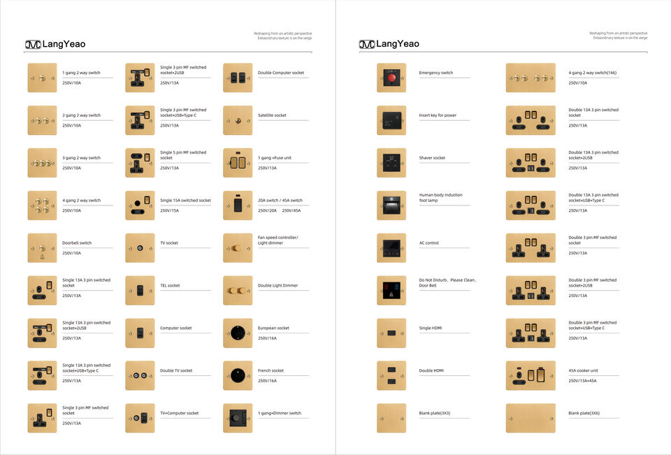 Interruptores de pared de latón LangYeao con panel de acero inoxidable, interruptor eléctrico de metal y enchufe, enchufe y tomas de corriente EU FR