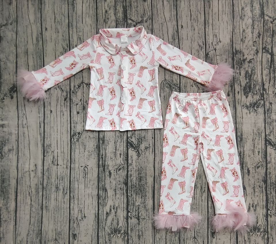 Botas de vaquera RTS con estampado de lazos, 2 piezas, boutique bonita, botones para niñas pequeñas, pijamas, diseño de plumas, ropa para niños, trajes