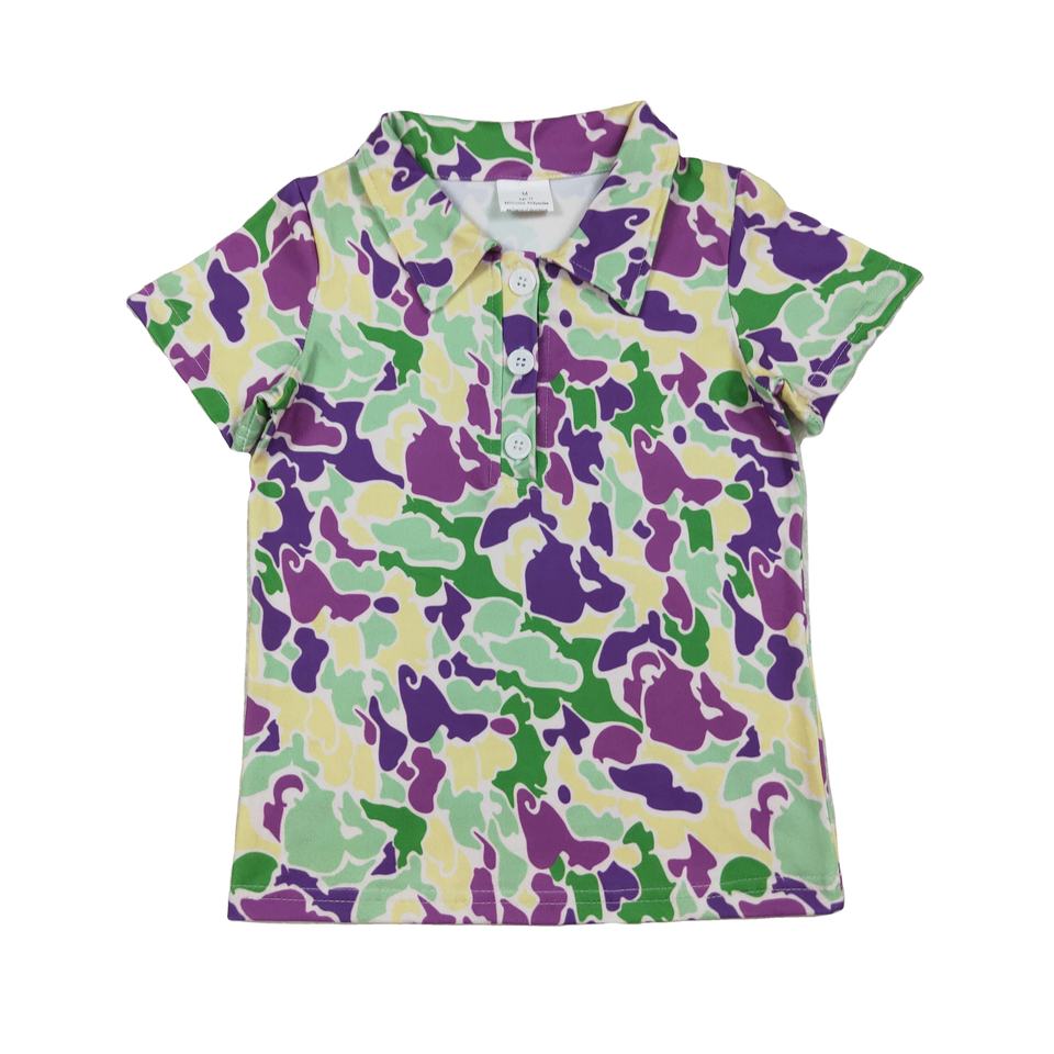 RTS Mardi Gras caza camuflaje estampado niños manga corta botones camisa ropa moda venta al por mayor niños ropa