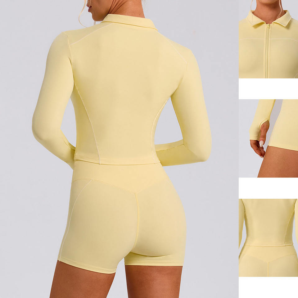 Conjunto de Yoga RUIQUWIN OEM Personalizado de Alta Elasticidad para Mujer, Top Deportivo con Cremallera, Pantalones Cortos Deportivos Transpirables que Absorben la Humedad y Realzan los Glúteos