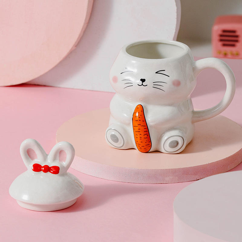 Taza de leche de cerámica con diseño de conejo y zanahoria, con tapa y asa, para uso doméstico, juego de dos piezas para desayuno y café.