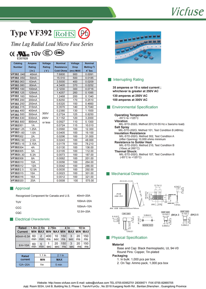 Radial Lead Micro Fuse Vf392 Alto rendimiento 40Ma-20A con retraso de tiempo Precio competitivo Fusibles de alto rendimiento