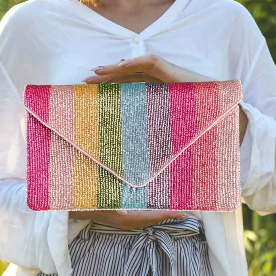 Bolso de Mano Tipo Clutch con Cuentas de Colores Verticales en Forma de Sobre, Bordado con Cuentas de Semillas Multicolores, Bolso de Fiesta para Mujer