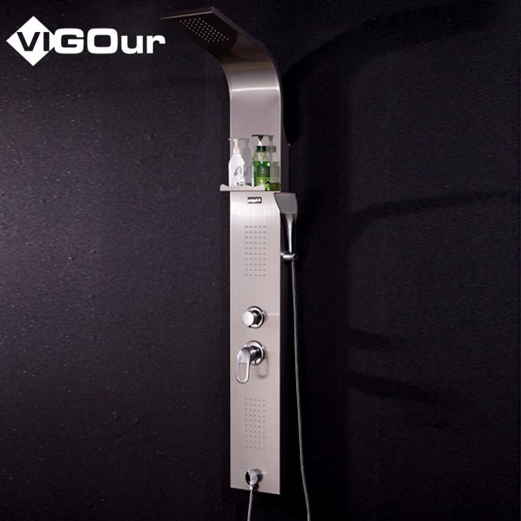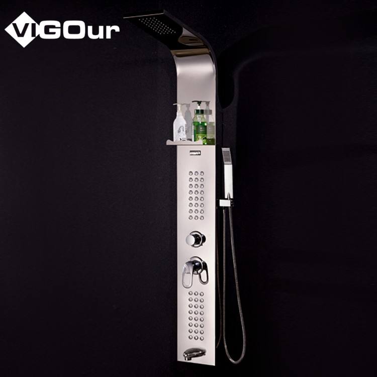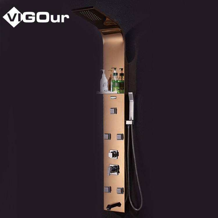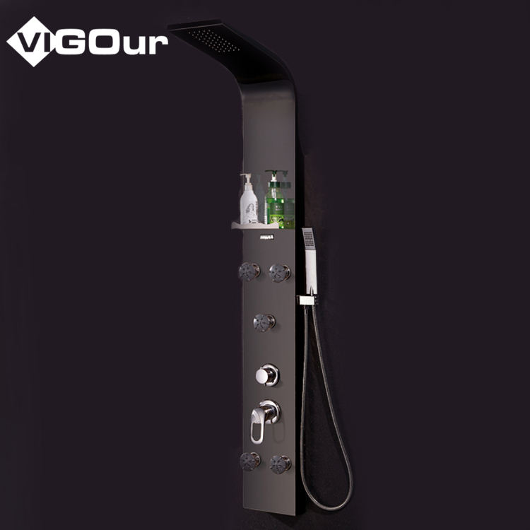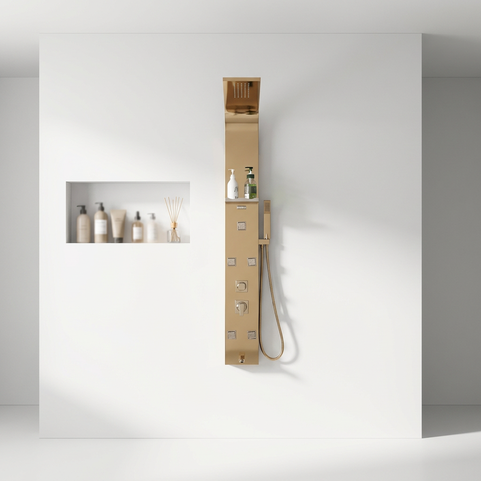 Sistema de Ducha de Lluvia con Panel, Torre, Jets de Masaje Corporal, Rociador de Mano y Estantes para Ducha