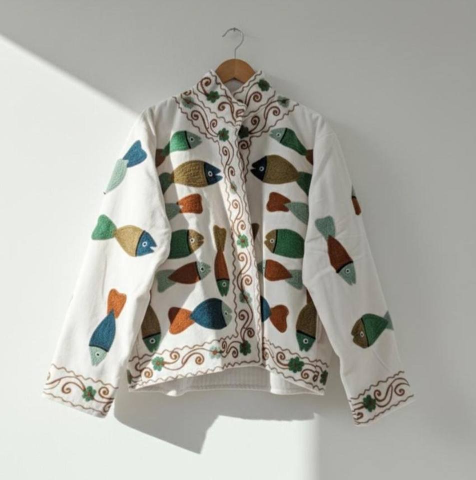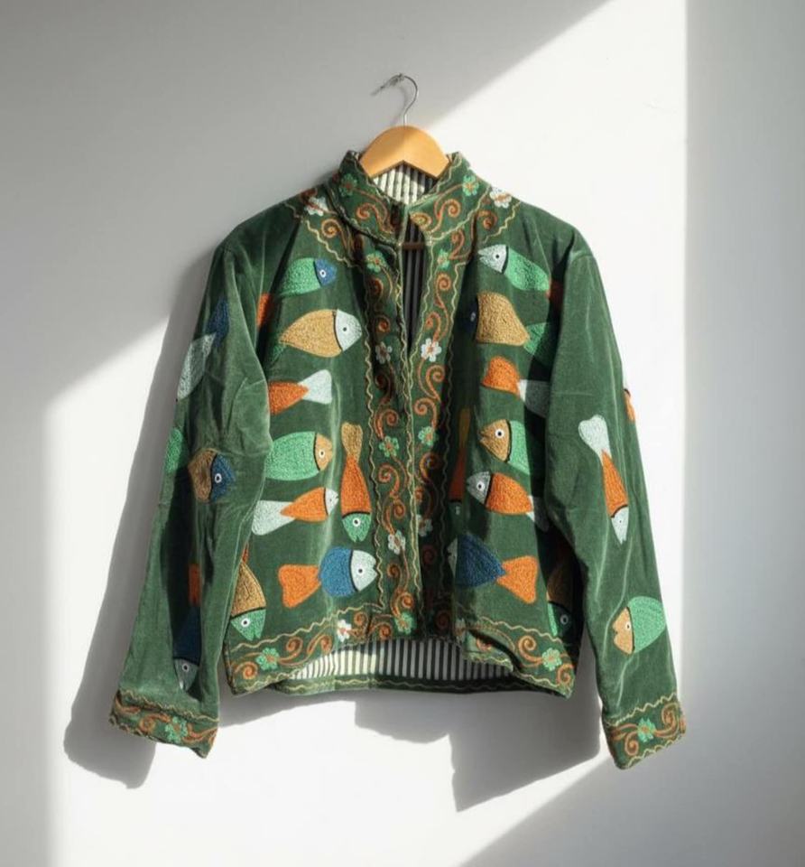 Chaqueta de Lona con Bordado Sujani de Textil Rajasthani con Diseño de Peces, Disponible en Todas las Tallas