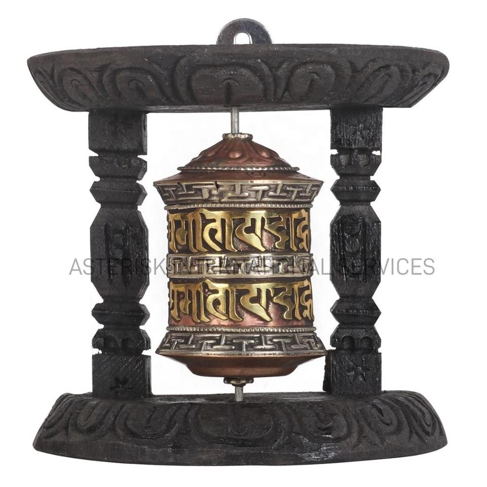 Rueda de Oración Tallada con el Mantra Budista Om Mani Padme Hum en Marco Metálico - Hecho en Nepal
