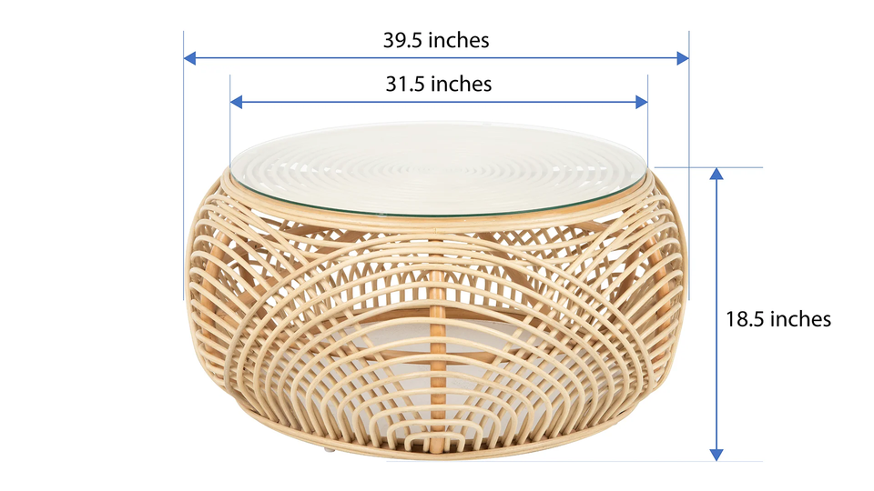 Mesa de café de ratán con tapa de vidrio:Tamaño: D39,5 x H18,5 pulgadas