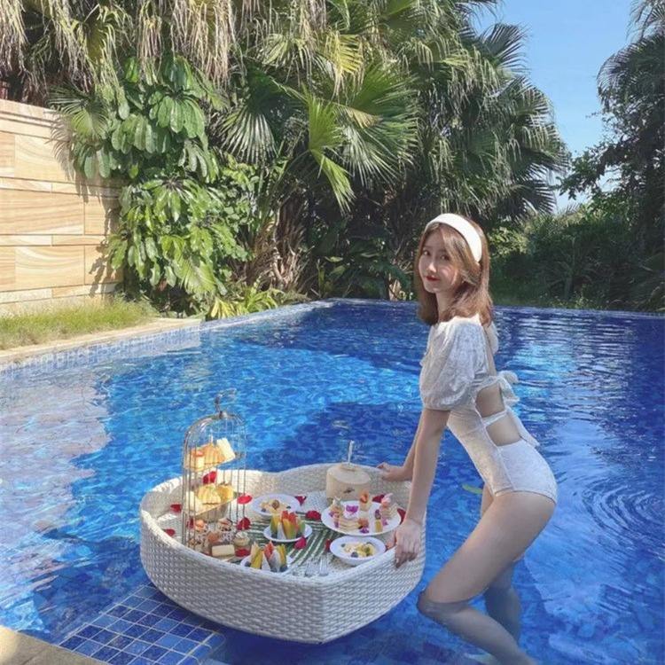 Bandeja flotante de ratán para servir desayuno junto a la piscina con diseño hecho a mano con material de bambú y ratán.